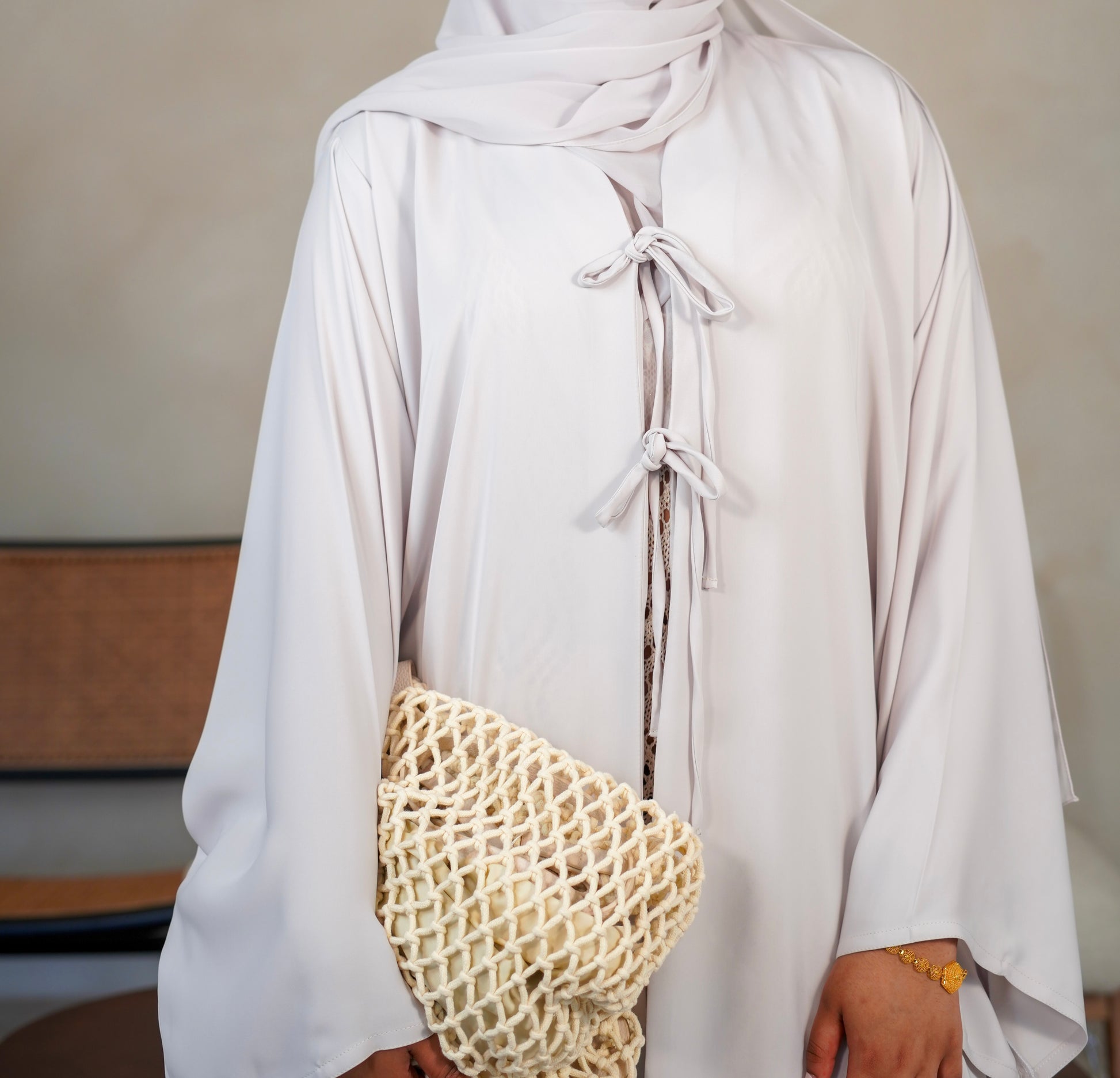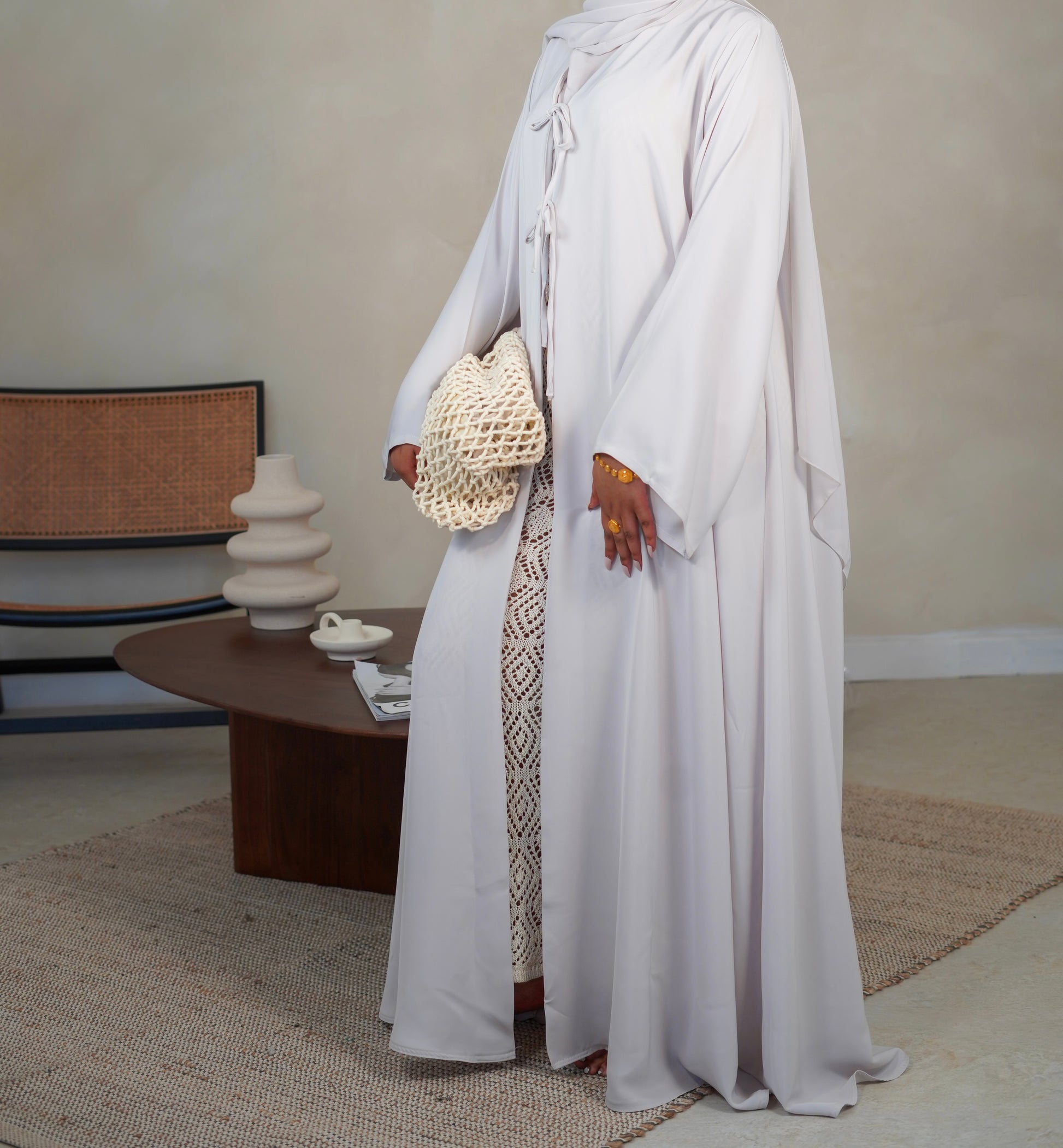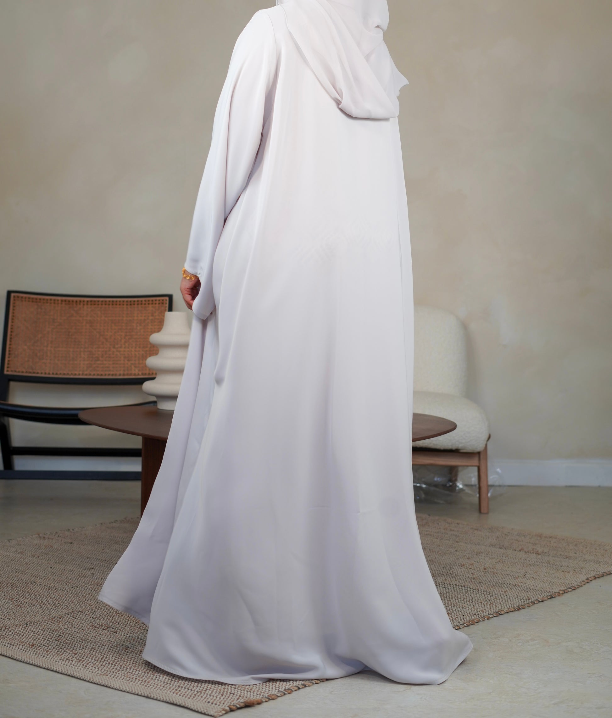 This Beige Abayah is cut in a flowing umbrella silhouette that moves beautifully with every step. It features two front ties for an elegant finish and wide sleeves with buttoned cuffs for a comfortable, adjustable fit. Paired with a matching hijab, it’s an effortless set for both everyday wear and special occasions.