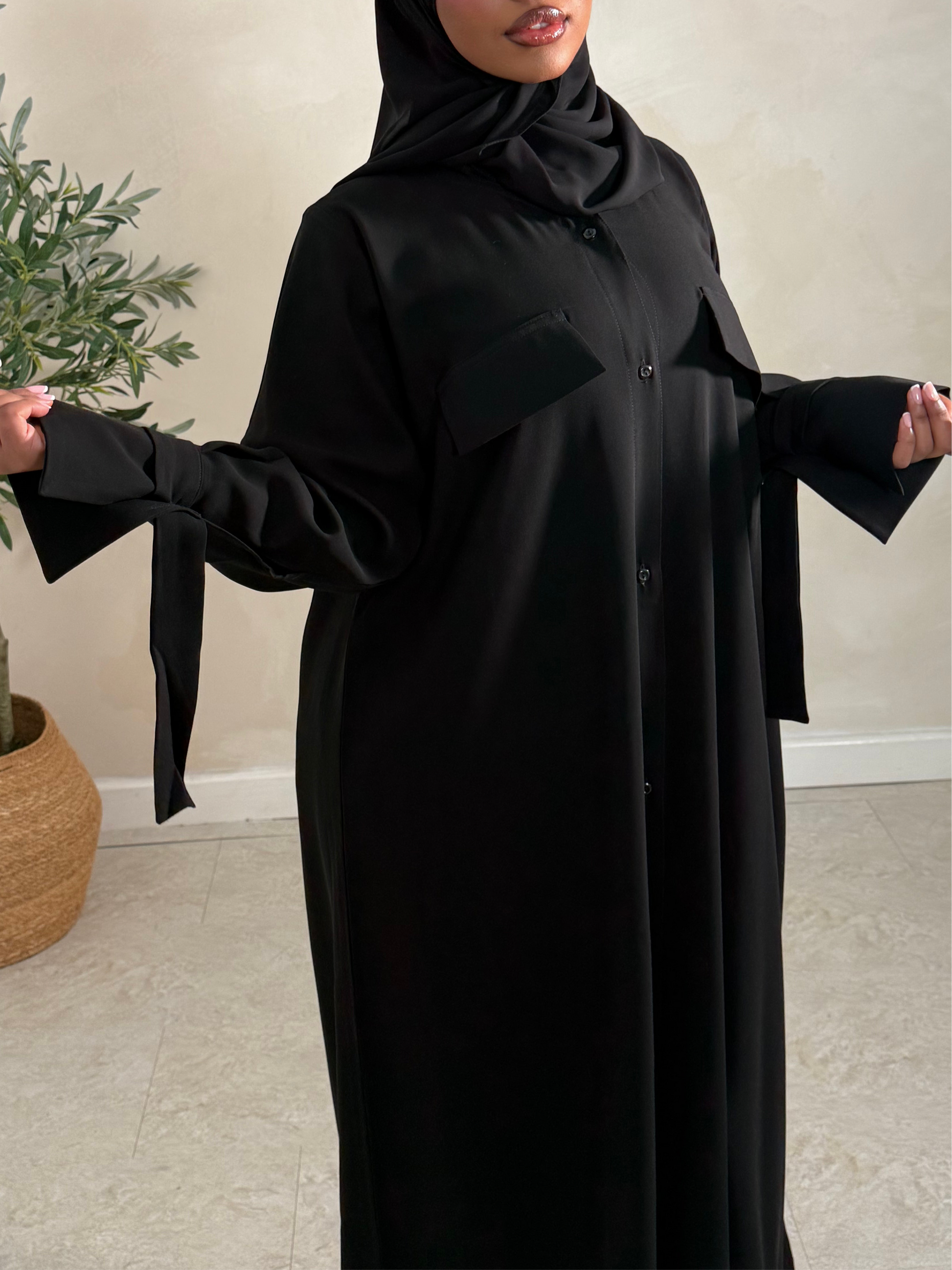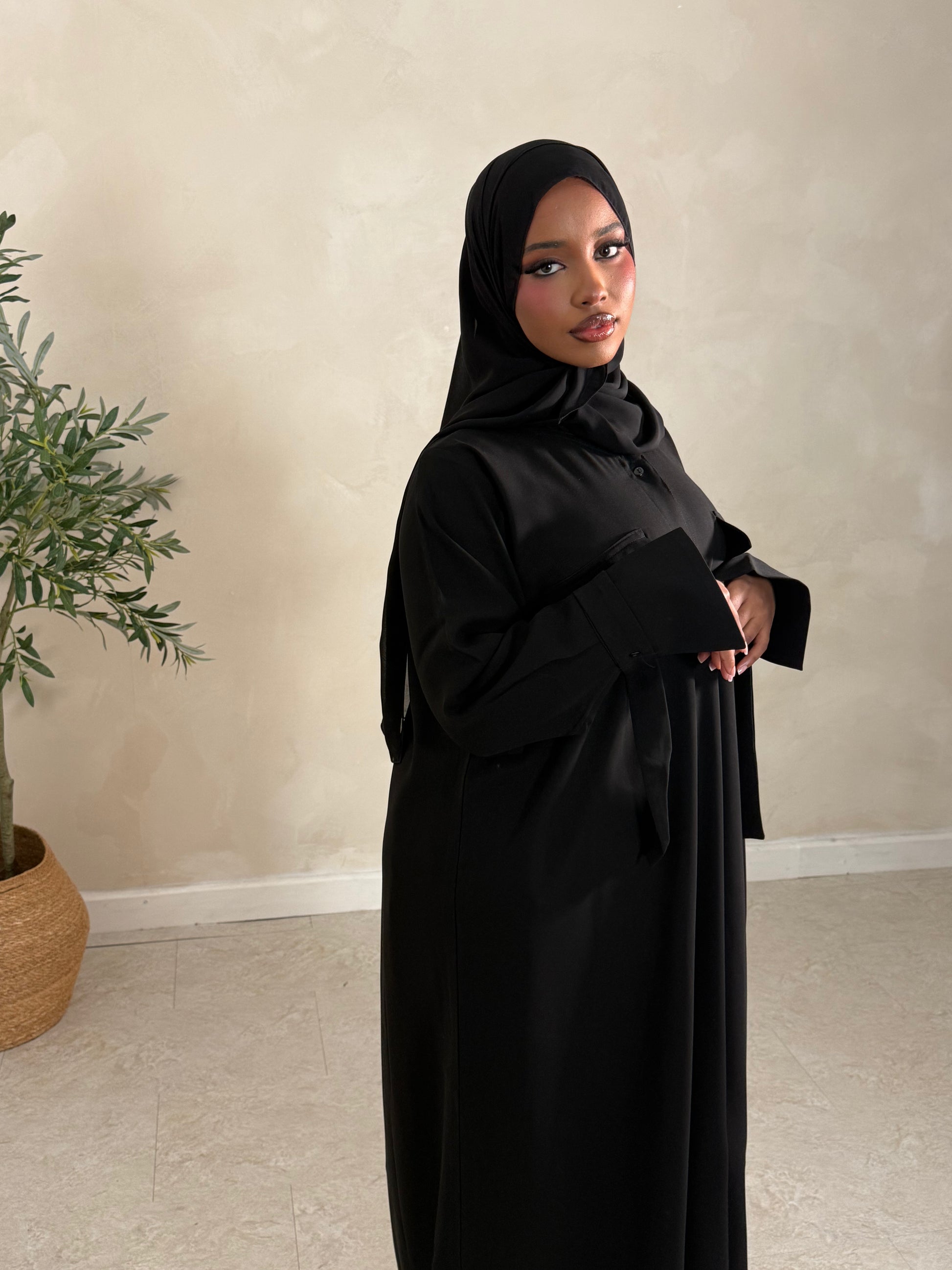 A graceful blend of sophistication and timeless style, the Hadiyatt Blouse Abayah is designed for the woman who values elegance in every detail. This button-up abayah features an industrial-inspired look with subtle tailoring and two front pockets, combining practicality with polished style. The flowing silhouette drapes effortlessly, while buttoned sleeves with hand cuffs add a refined, functional touch. Perfect for both formal occasions and everyday refinement, this abayah embodies understated luxury—making it an essential piece in every elegant wardrobe.