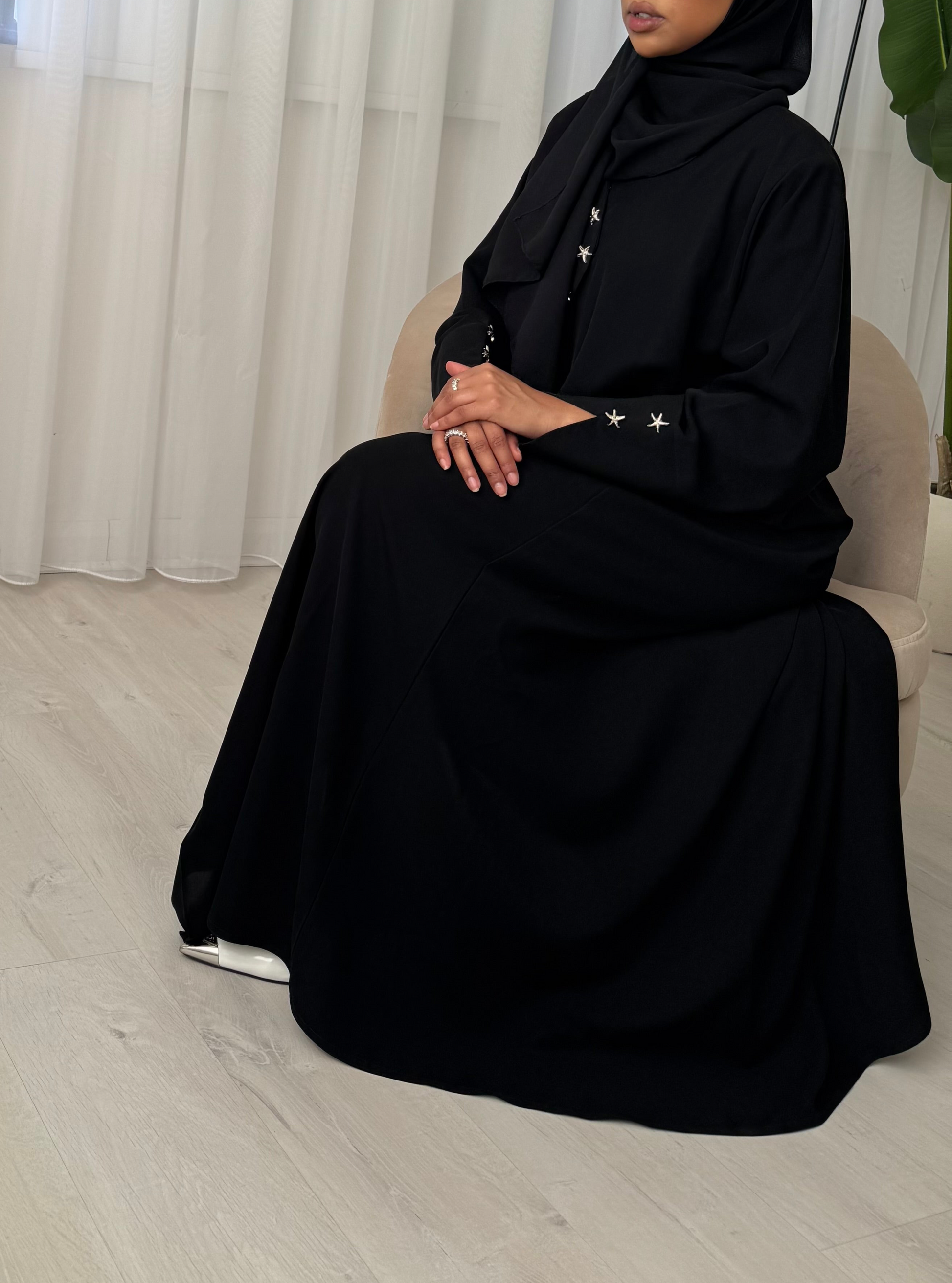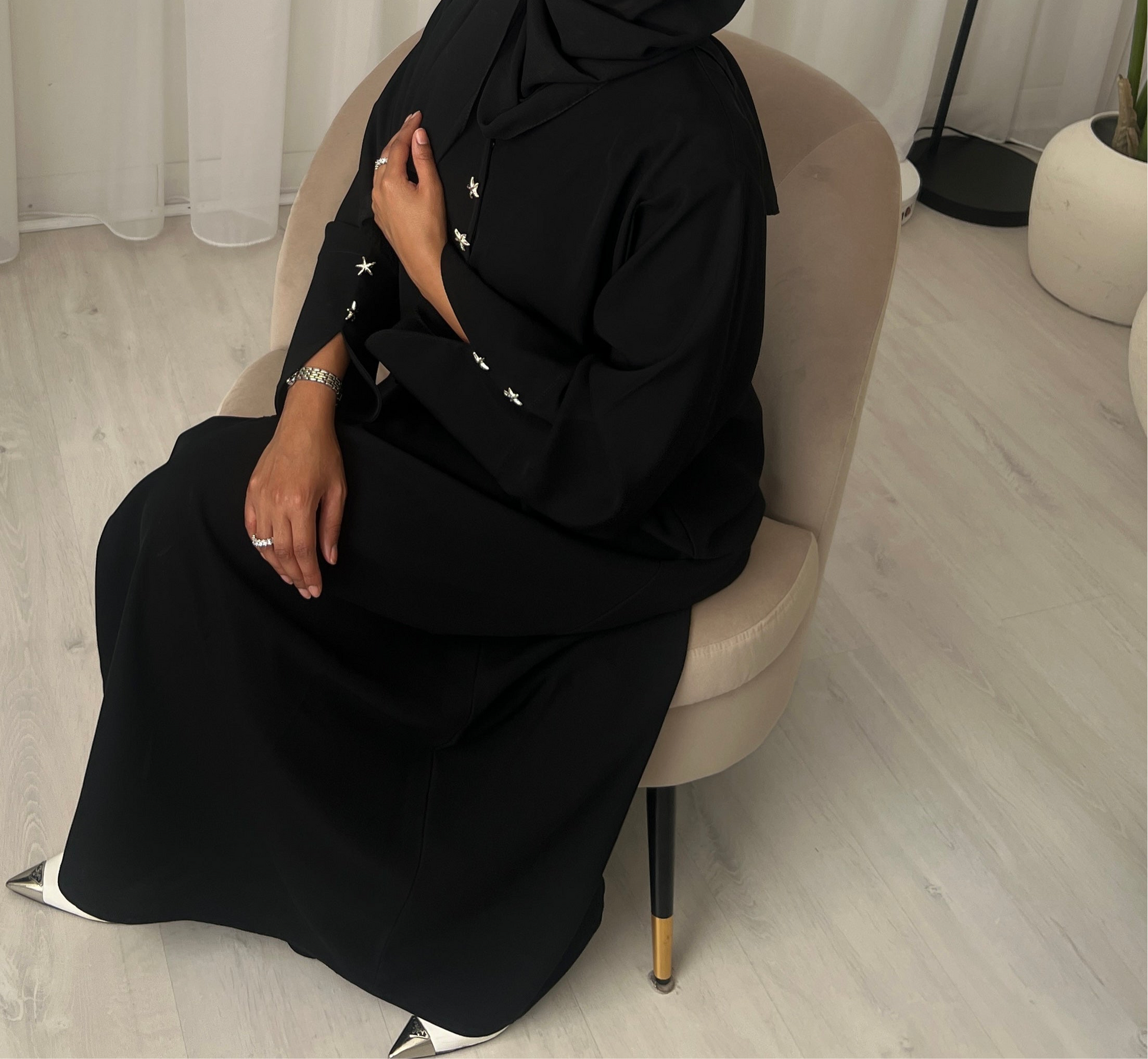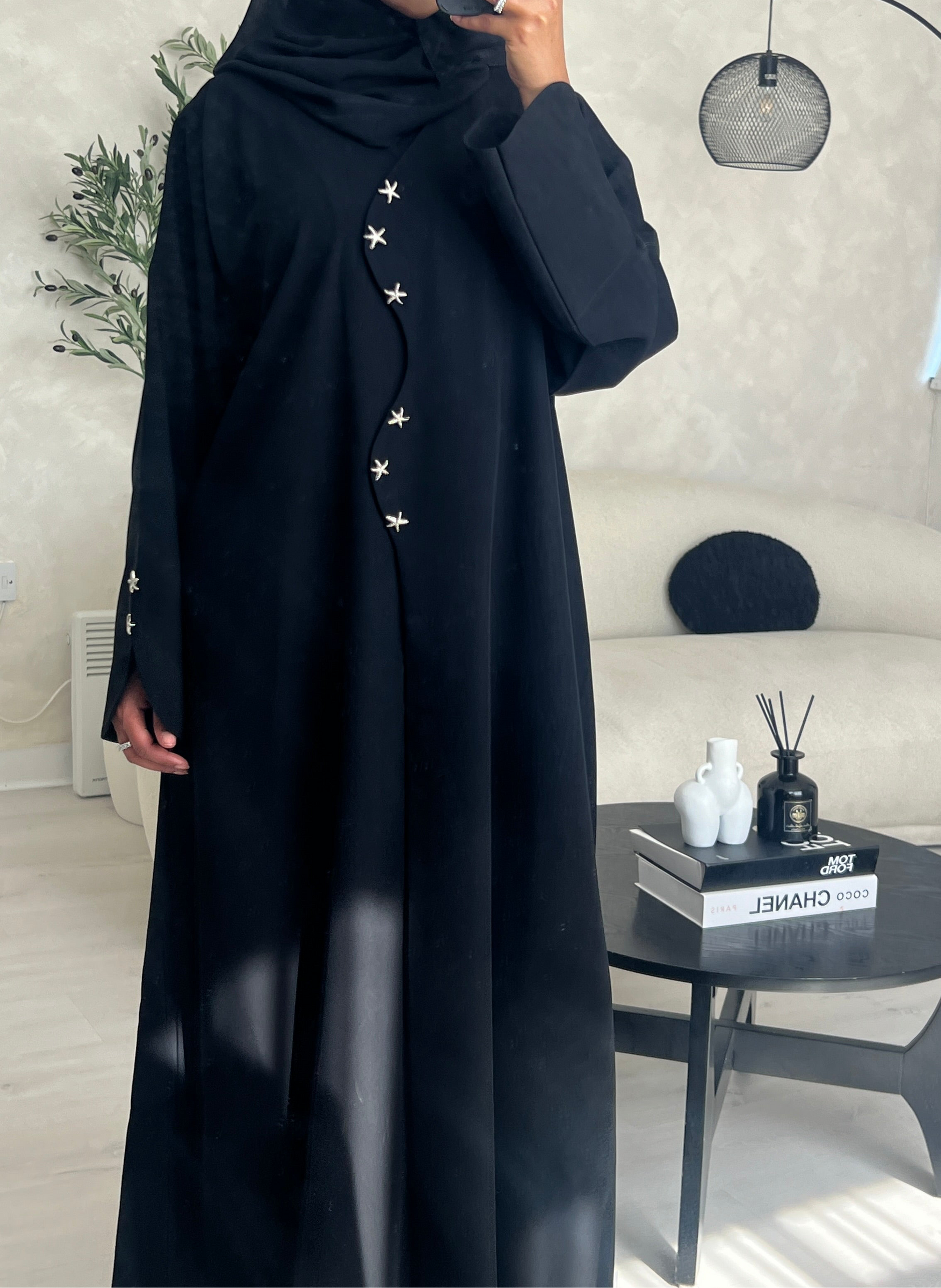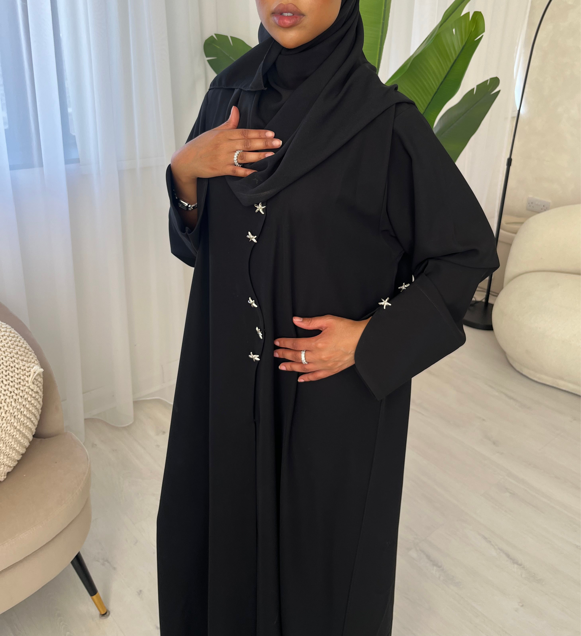 This Black Abayah is crafted in flowing crepe that drapes beautifully with every step. It features a curved slit along the sleeves, adorned with delicate starfish buttons for a subtle, elegant touch. Front starfish buttons provide a charming closure, while the loose silhouette ensures comfort and style. Paired with a matching hijab, it’s a graceful choice for both everyday wear and special occasions.