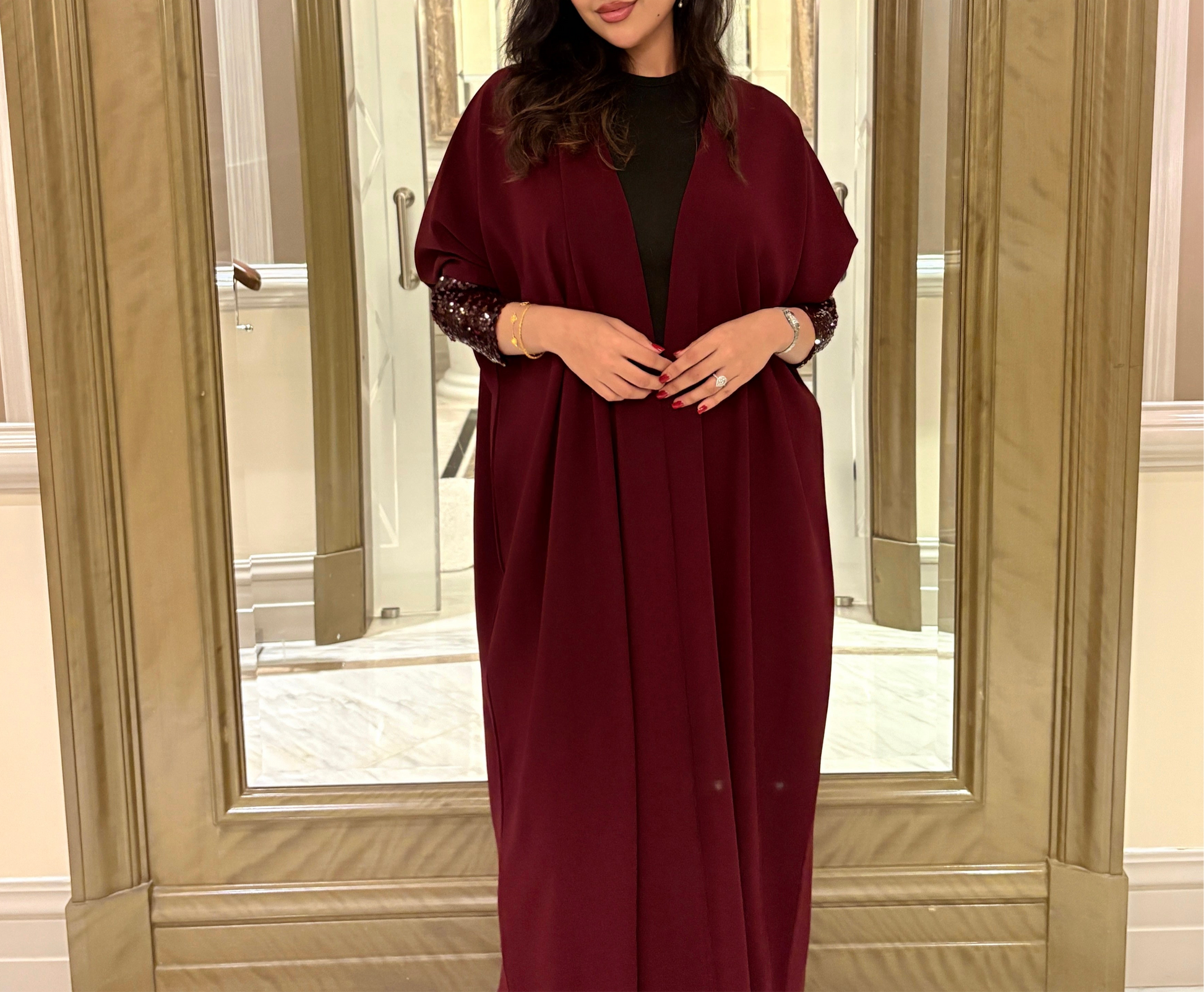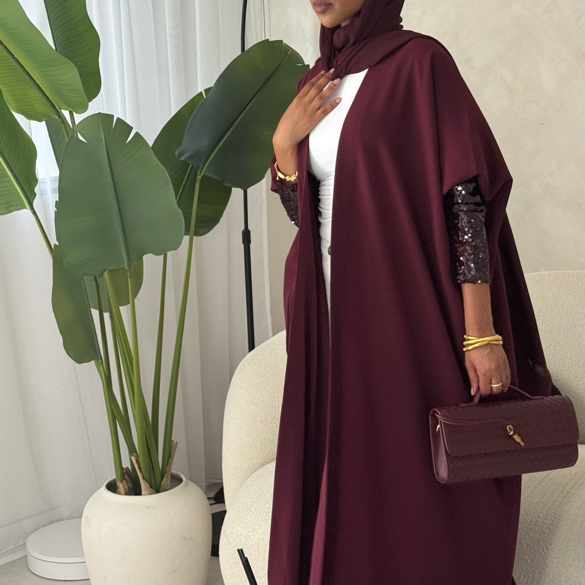 This Burgandy Open Abayah exudes full night-out glamour with a sleek, minimalist silhouette and flowing drape that commands attention. The open-front design allows for elegant layering over statement evening outfits, while the full-length sleeves adorned with sparkling sequins create a dramatic, luxurious effect. Paired with a matching hijab, this abayah transforms any ensemble into a show-stopping look for special occasions and formal events.