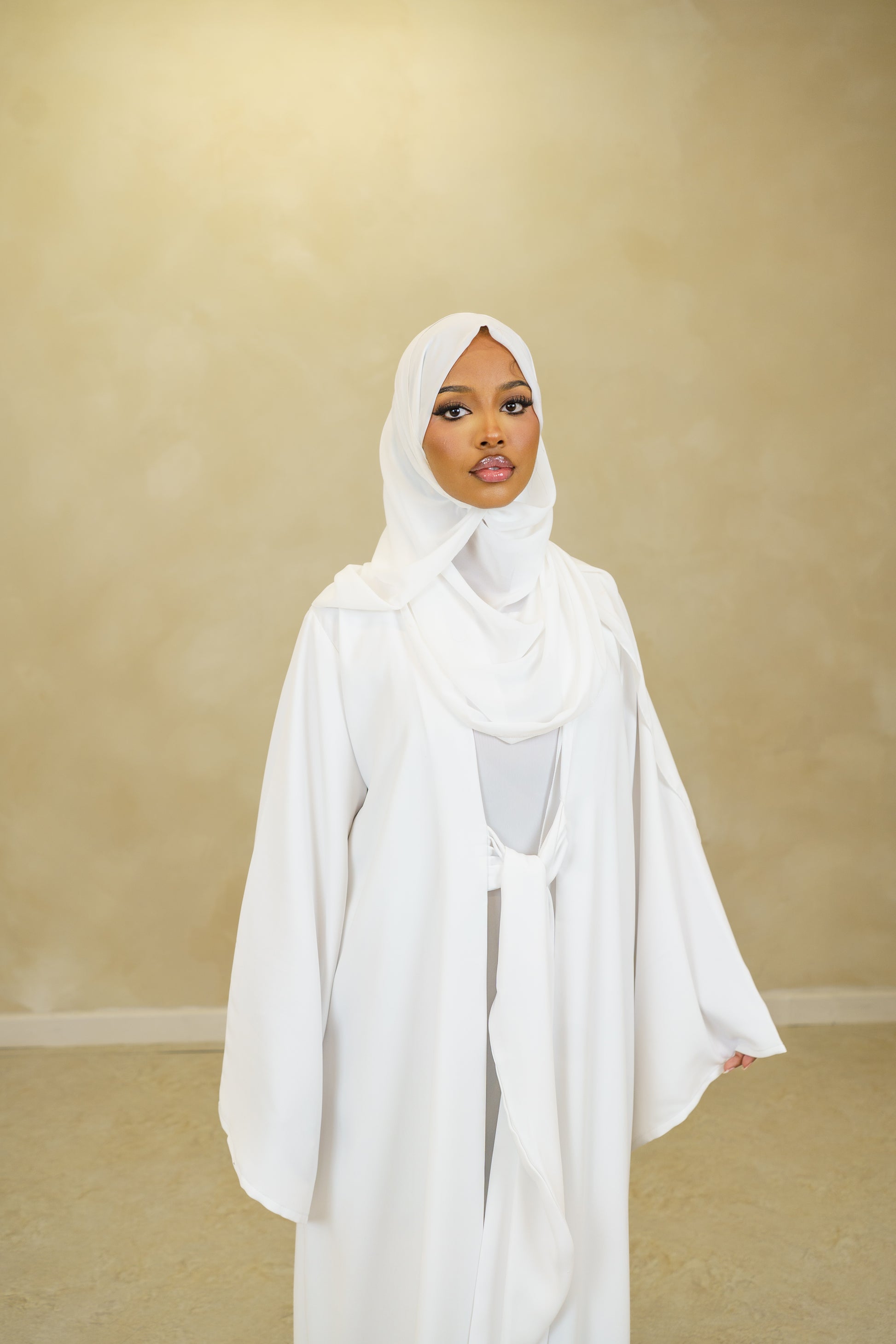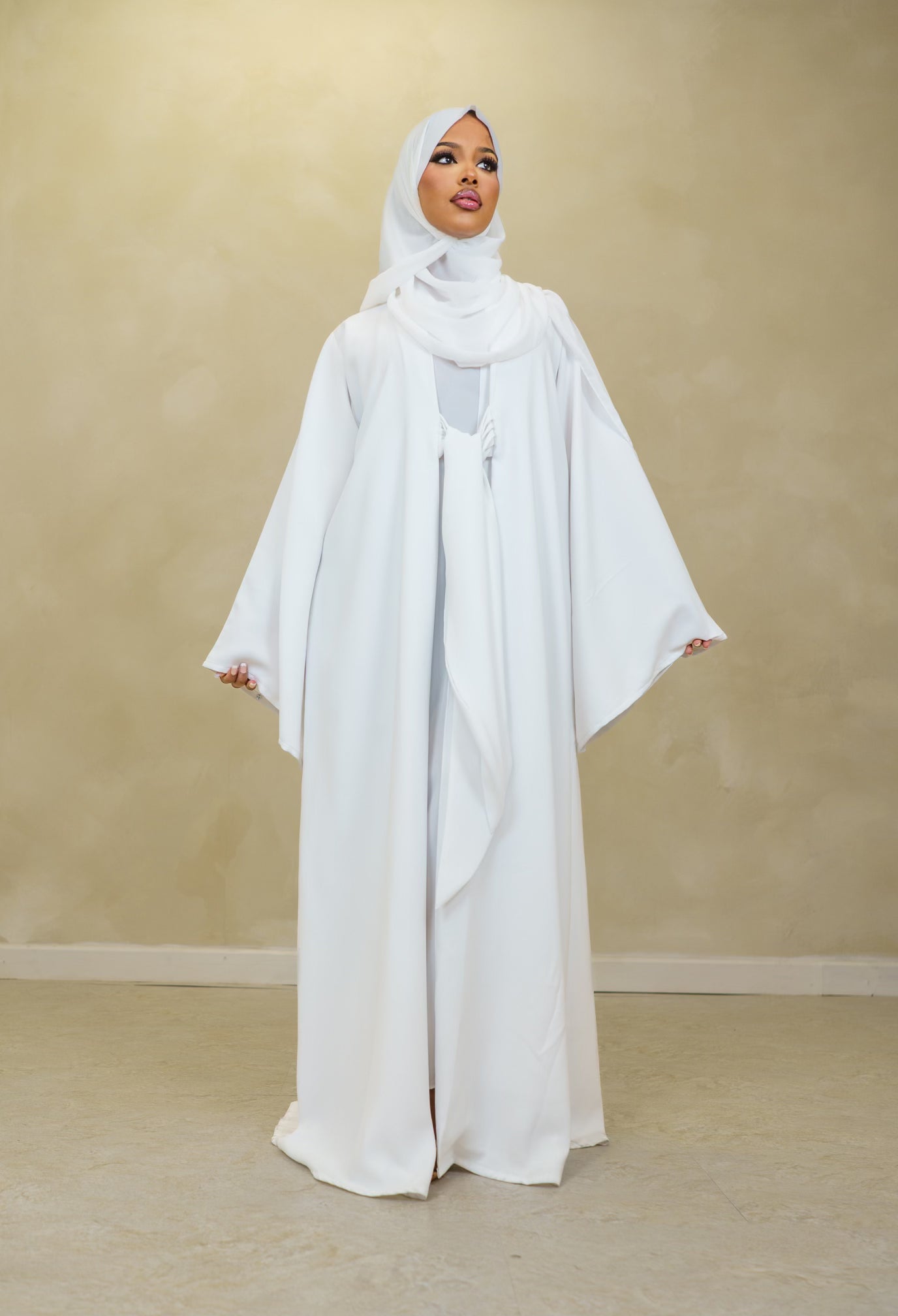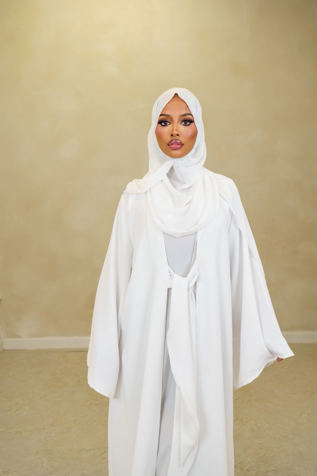The 3-piece abaya set includes a sleeveless dress adorned with shimmering sequins and stones, along with an ivory abaya featuring adjustable ties for a customized fit. Completing the set is a satin oversized Bahrain cut abaya with 3/4 sleeves. Designed to perfection for a graceful and sophisticated look, paired with a matching premium chiffon hijab in white.