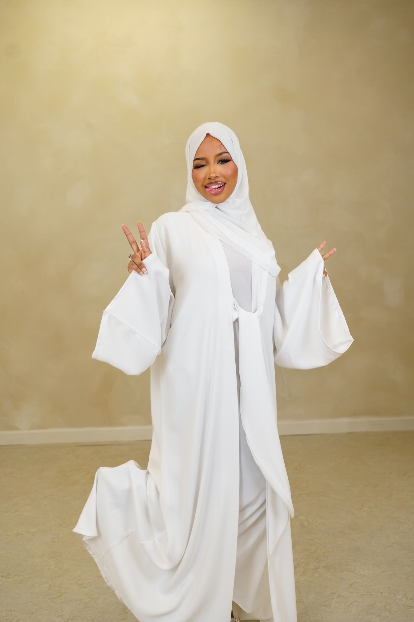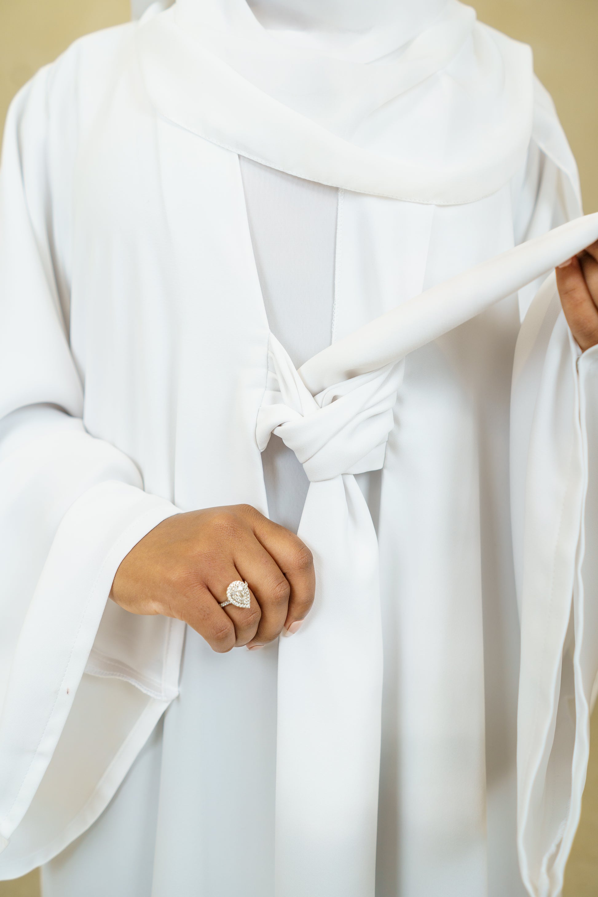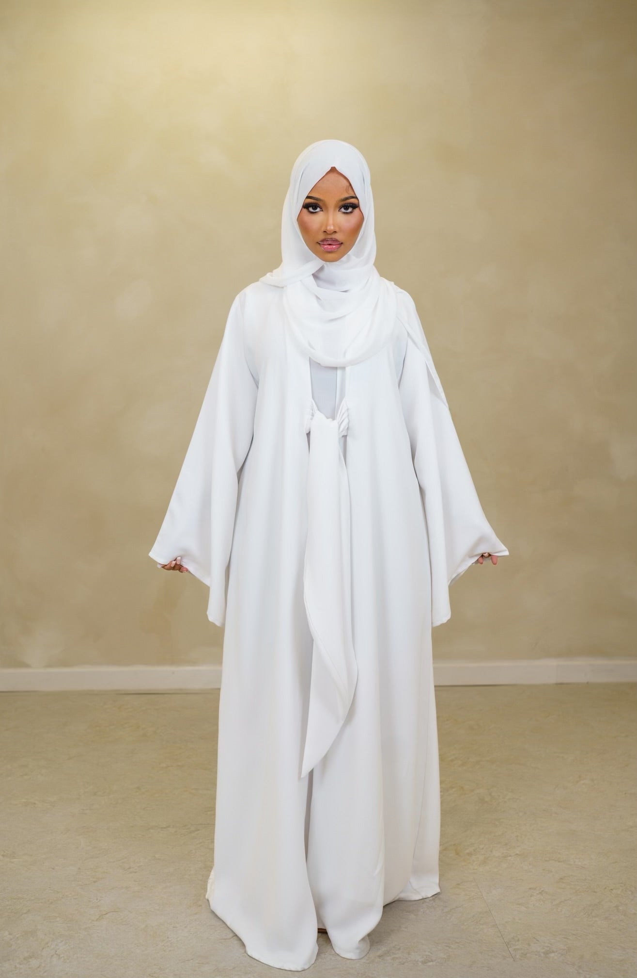 The 3-piece abaya set includes a sleeveless dress adorned with shimmering sequins and stones, along with an ivory abaya featuring adjustable ties for a customized fit. Completing the set is a satin oversized Bahrain cut abaya with 3/4 sleeves. Designed to perfection for a graceful and sophisticated look, paired with a matching premium chiffon hijab in white.