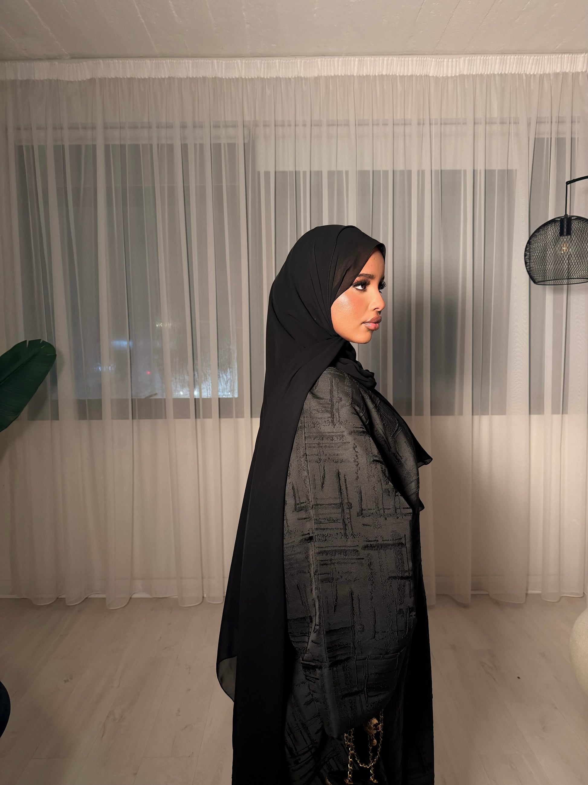 Detailing: Jacket style rigid fit Abayah with wide sleeves, wrap style to go with a black chiffon hijab.