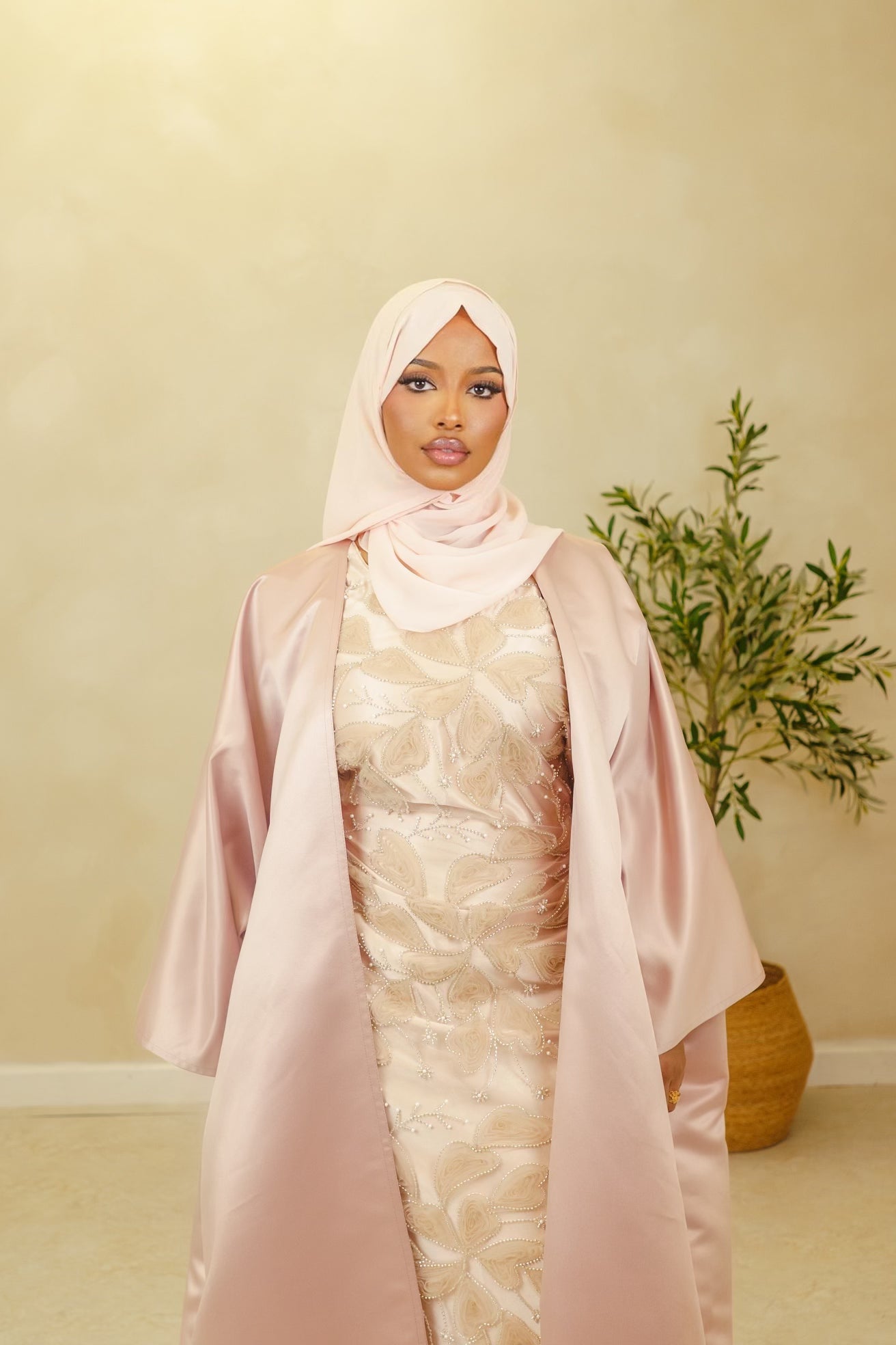 The 3-piece abaya set consists of a sleeveless dress embellished with sparkling sequins and stones that has adjustable ties for a tailored fit. Completing the set is a satin oversized Bahrain cut abaya with 3/4 sleeves. It's designed for a graceful and sophisticated appearance, along with a matching premium chiffon hijab.